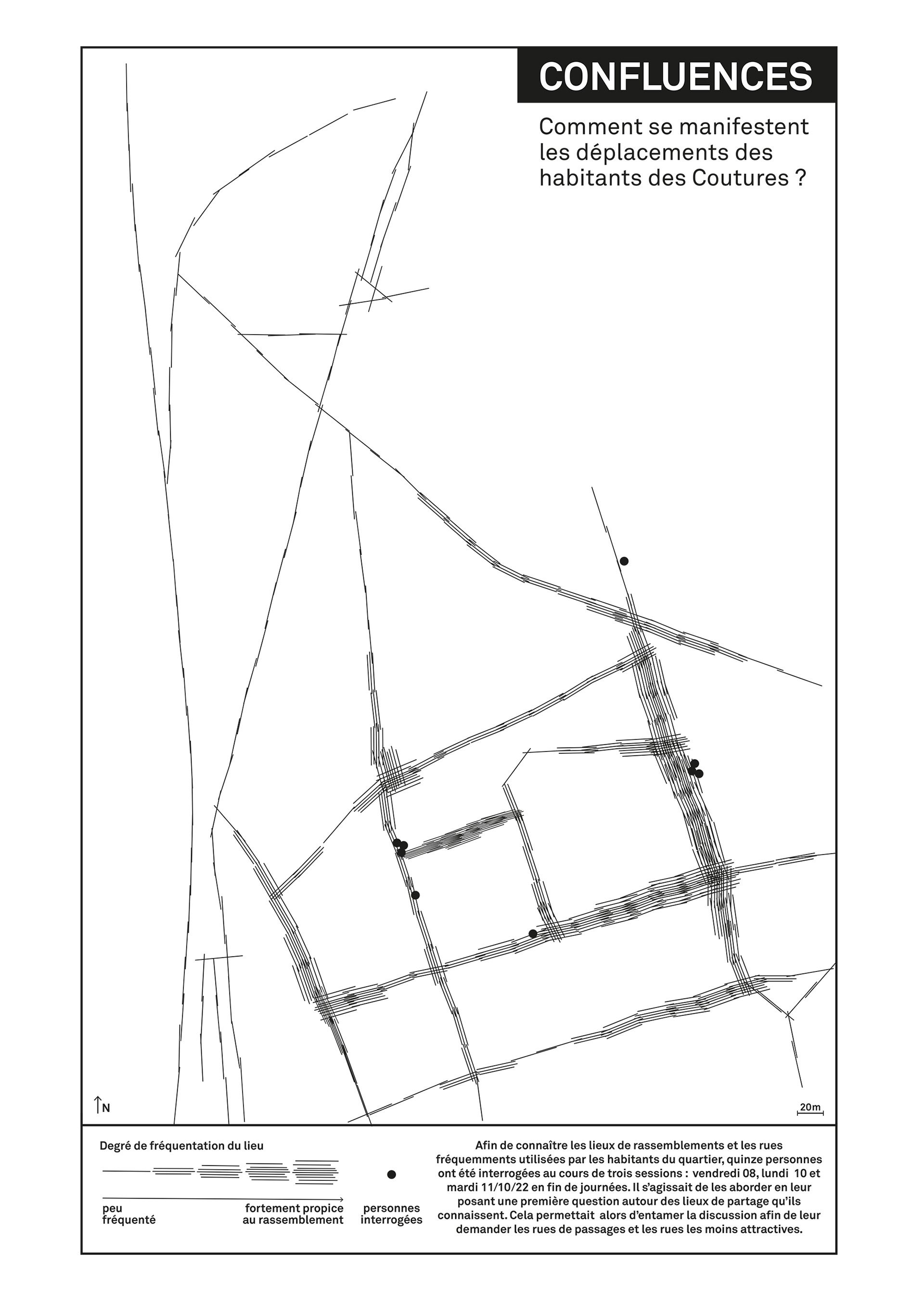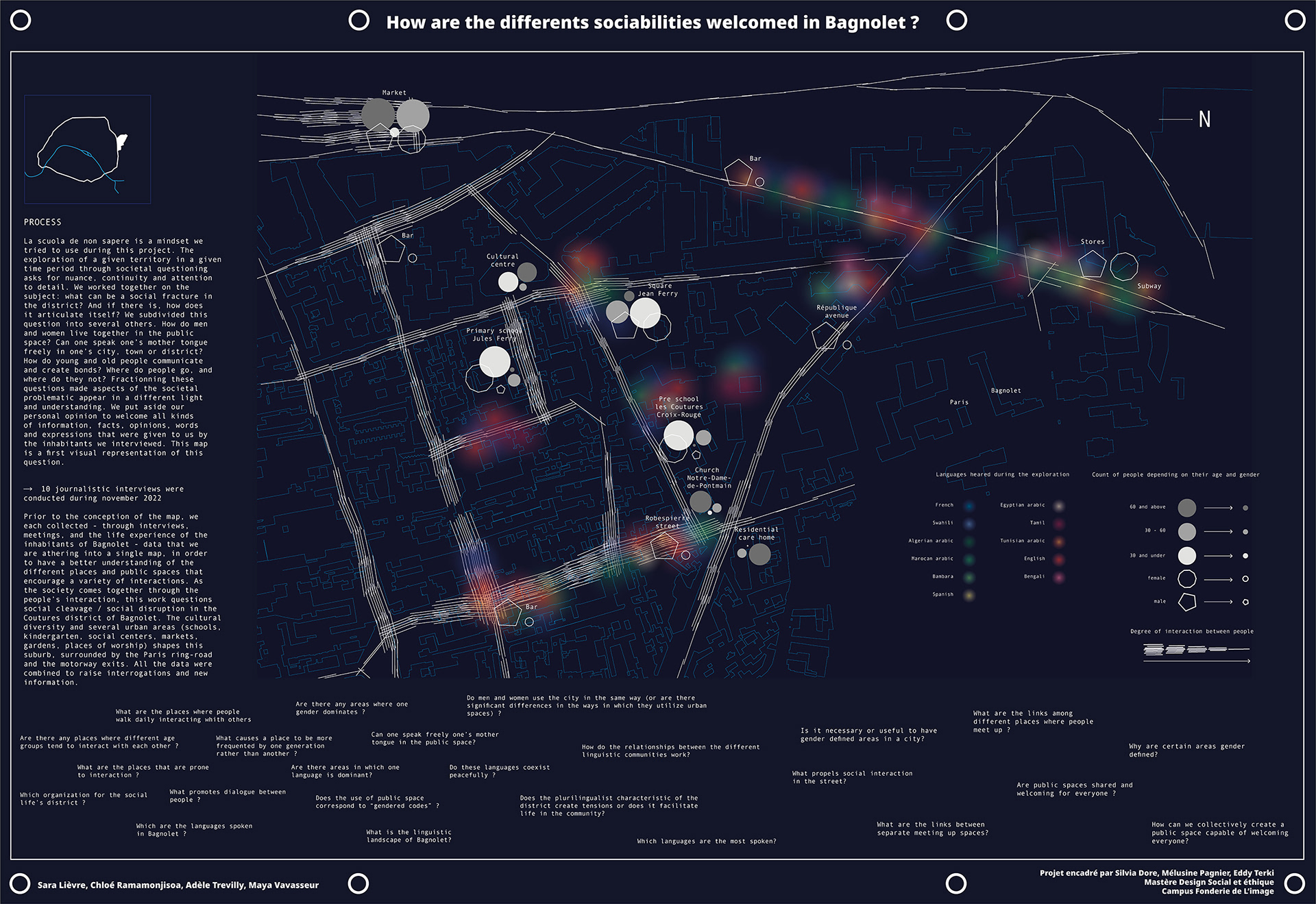 À travers des temps d’immersion territoriale, nous sommes allés à la rencontre des habitants du quartier afin de les interroger sur les rues empruntées, les lieux de passage, de rencontre et comprendre les déambulations des usagers dans le quartier. Une version augmentée de la cartographie, mise en commun avec 3 autres élèves, permet de révéler la diversité des langues parlées, des âges et des genres représentés par les personnes interrogées dans l’espace public. Cette cartographie combinée a été présentée à Milan pour l’exposition « l’école du non-savoir » porté par l’association Civic City.