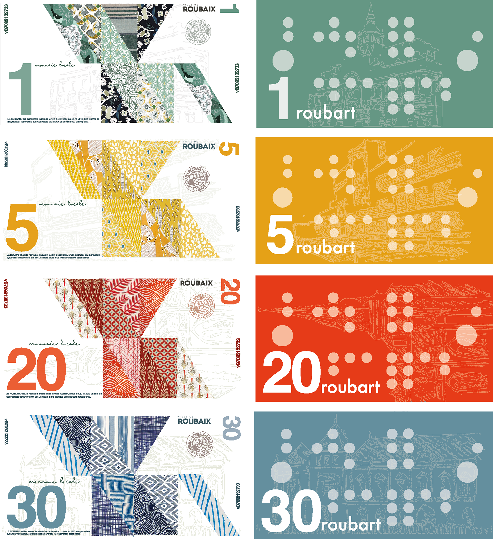 Projet fictif de conception d'une monnaie locale complémentaire pour la ville de Roubaix. Les visuels des billets mettent en avant le motif textile et résonnent ainsi avec le passé industriel de la ville. Les filigranes illustrent des bâtiments architecturaux remarquables de la ville. Le motif au dos fait référence aux cartes perforées ou cartes "Jacquard" utilisées sur les métiers à tisser pour créer ces motifs.