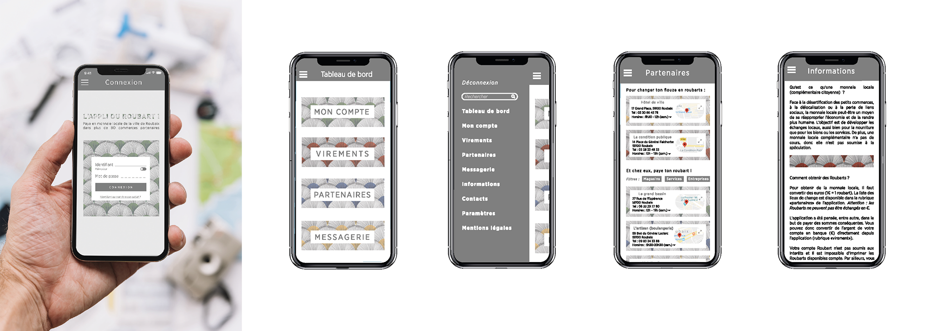 Mise au point d'une application permettant de payer en Roubarts, suivre ses dépenses et gérer son compte. Le volet partenaires répertorie les commerces qui acceptent la monnaie locale.